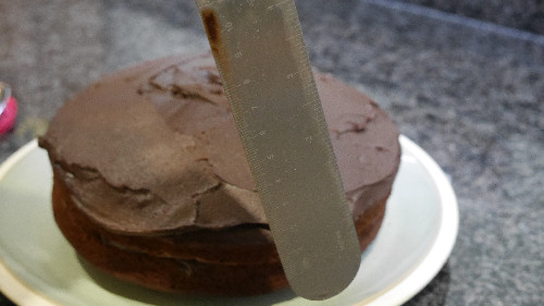 To do this, first boil the litre of water and put in measuring jug and place the pallet knife in it. The reason behind this is to heat put the pallet knife up so it will ice the cake more smoothly. Now to start the icing, place the first cake onto a plate, up-side-down and, using a dessert spoon, place a dollop if icing sugar onto the cake and spread out, do this so the entire cake is covered and place the other cake on top – the right way up.