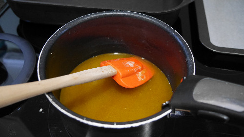 Now whilst, the pan is heating up you can get the dry ingredients ready: for this you will need to get the flour and ginger in a separate bowl and there you are. If you like, for something to do, you can mix them together. Once the sugar has dissolved, and the contents of the pan are a smooth liquid,