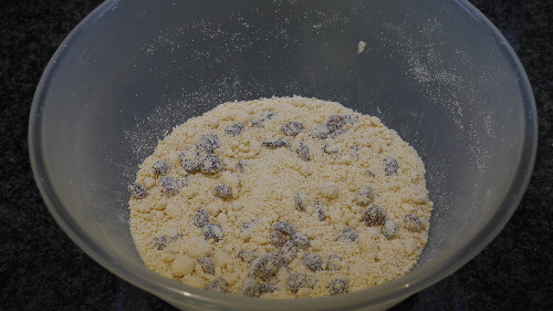 Rub the margarine into the flour for about 2-3 minutes, you should have the texture of fine wet sand. Now stir in the sugar with a wooden spoon and add the raisins or sultanas or currants. Currants are best for cooking with, but they can be easily substitutes for sultanas or raisins; also, it depends on how you like them to taste, as we all have slightly different preferences.